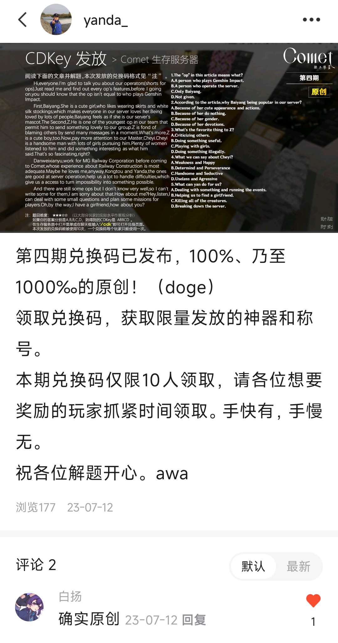 目录 搜索 展开 了解兑换码活动往期兑换码汇总第1期~第5期(旧版)第一期第二期第三期第四期第五期第六期第七期第八期第九期第十期第十一期第十二期第十三期第十四期玩家贡献兑换码玩家贡献1玩家贡献2 暂无相关搜索结果! 阅读次数:53 本文档使用 MinDoc 发布 第四期 CDKey 第四期 制作日期:2023.7.2发放日期:2023.7.12本期题目由 YanziHa0 创作,liyanda0349 发布。 原问题答案相关内容公告 作者:liyanda0349 创建时间:2025-01-13 13:13最后编辑:liyanda0349 更新时间:2025-02-08 15:13 提交评论